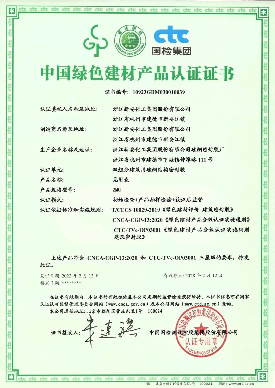 新安作為綠色化學的領創者,緊跟國家綠色低碳發展步伐,通過發揮硅基新材料產業鏈優勢,積極探索綠色建筑密封解決方案,近期新安旗下8款建筑密封膠產品通過中國建材檢驗認證集團股份有限公司(CTC國檢集團)的檢測,榮獲《中國綠色建材產品認證證書》。