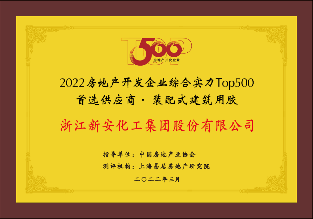 獲評“2022中國房地產開發企業綜合實力Top500首選供應商-裝配式建筑用膠”